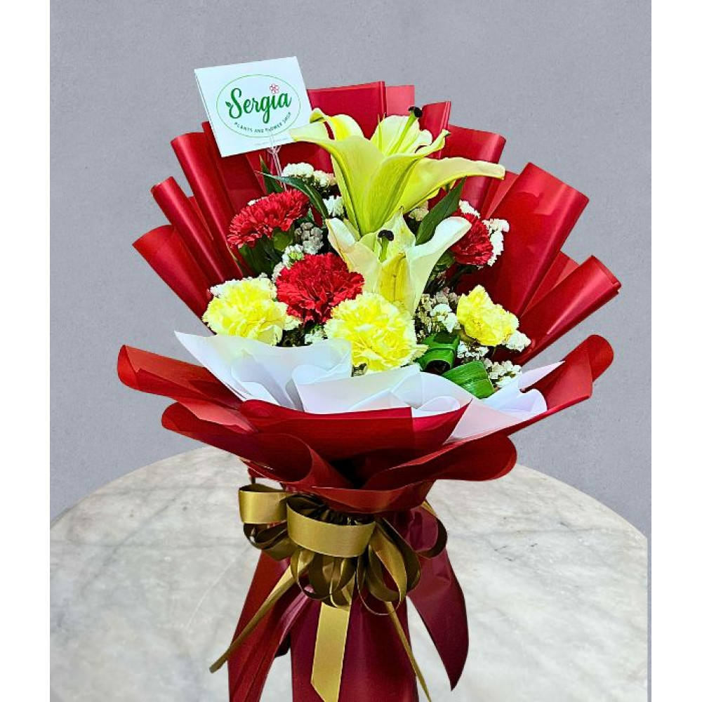 This vibrant arrangement features a beautiful mix of red carnations, yellow carnations, and a lily complemented with delicate filler flowers. Wrapped in elegant red paper and finished with a gold ribbon, this bouquet makes a perfect surprise to celebrate someone’s milestone.