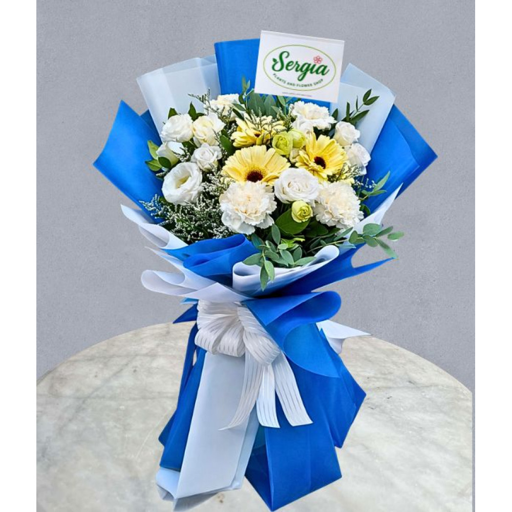This bouquet features a combination of white carnations and yellow gerberas, together with filler flowers. Beautifully arranged in a blue-and-white wrapper, then tied with a white-striped ribbon. This arrangement is an ideal graduation surprise for someone close to your heart.