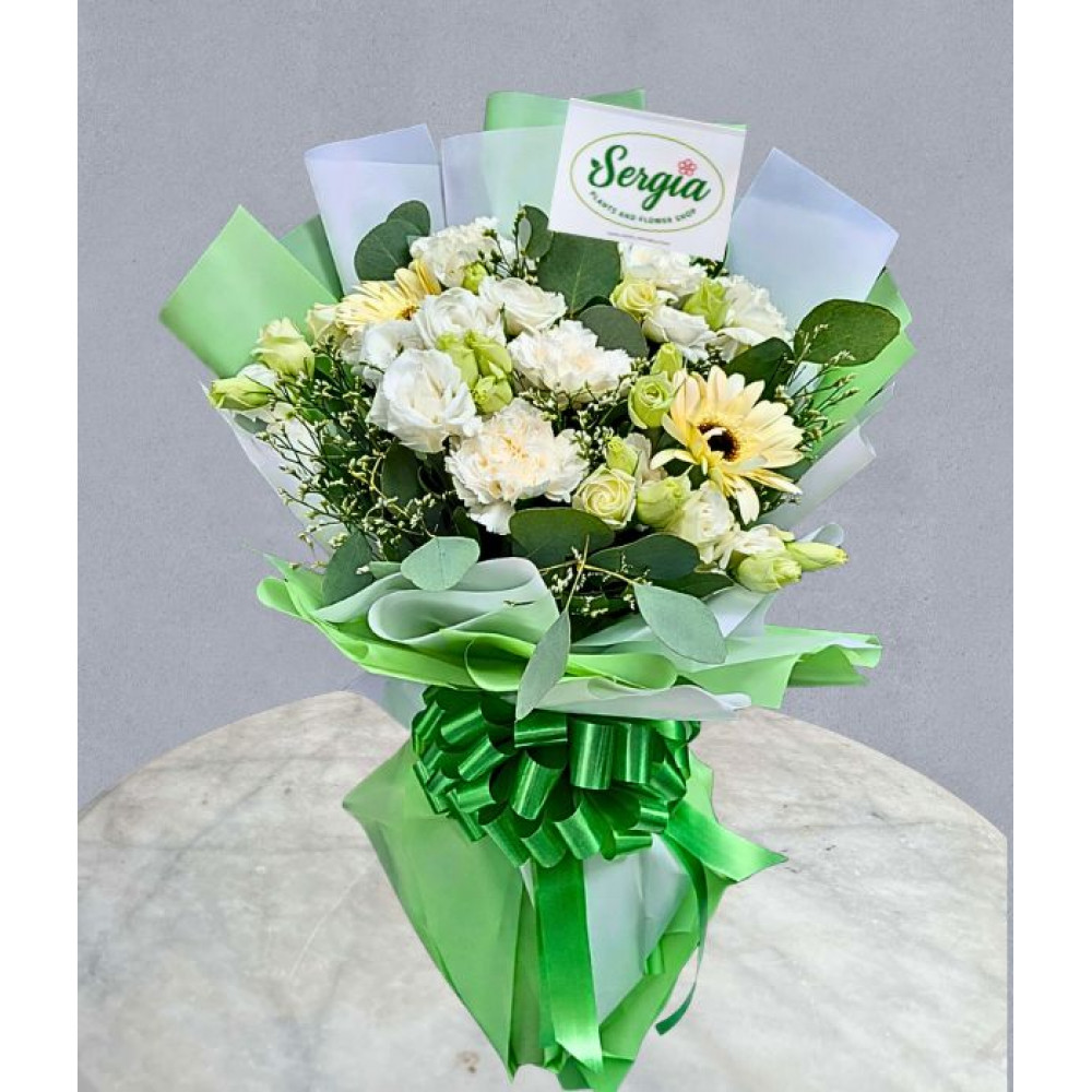 This charming bouquet features a lovely blend of white carnations and yellow gerberas, accented with delicate filler flowers. Wrapped in elegant white and green paper and finished with a green ribbon, it’s a perfect graduation surprise for someone special.