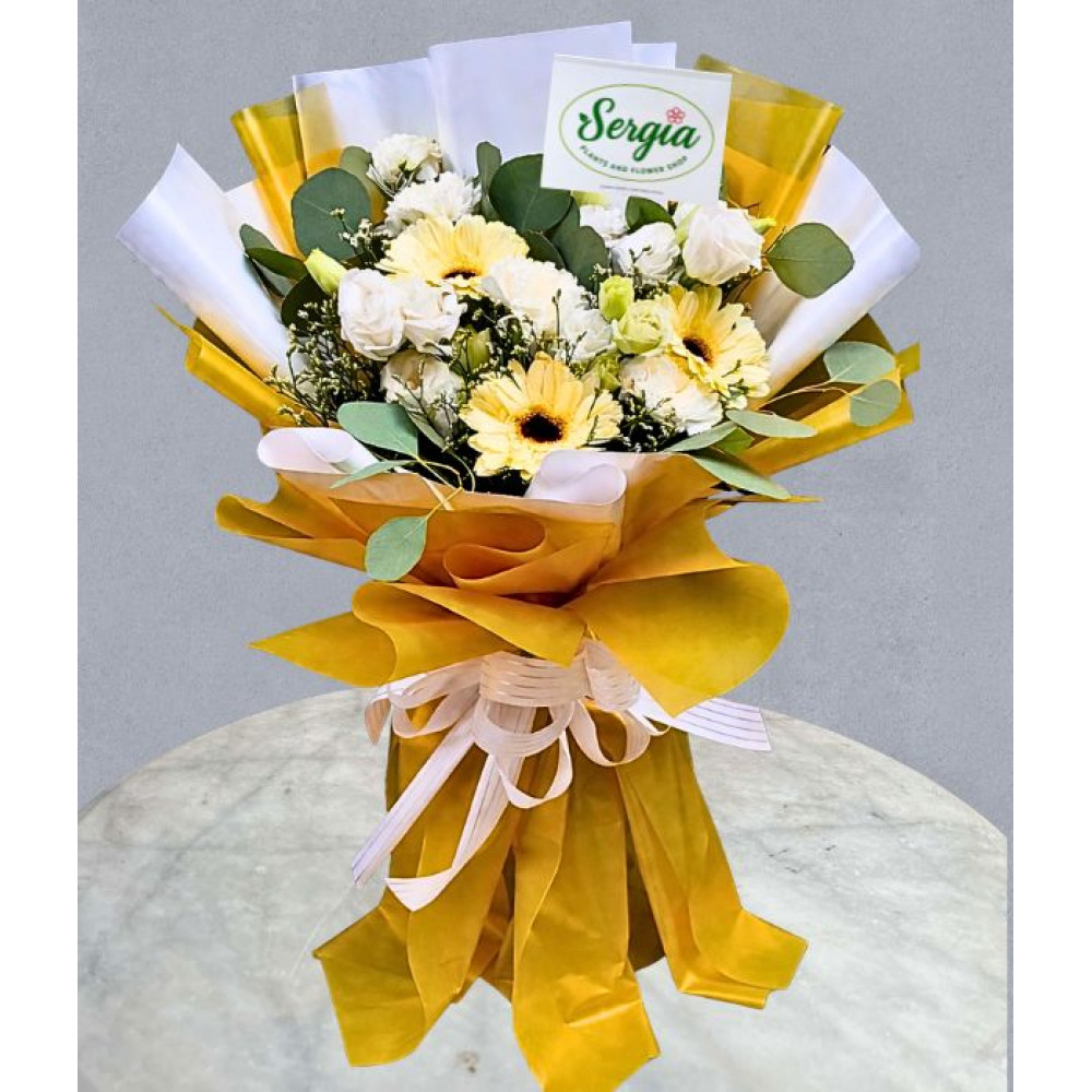 This lovely bouquet showcases a charming mix of white carnations and yellow gerberas, accented with delicate filler flowers. Wrapped in elegant yellow and white paper and finished with a white ribbon, it’s a thoughtful graduation surprise for someone special.