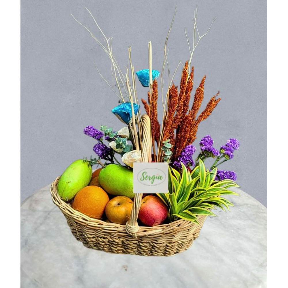 This vibrant gift basket features an assortment of fresh, colorful fruits, including mangoes, oranges, and apples, paired with stunning decorations of dried flowers. Perfect for any occasion, it combines the beauty of nature with the sweetness of fruits, making it an ideal choice for special celebratory events.