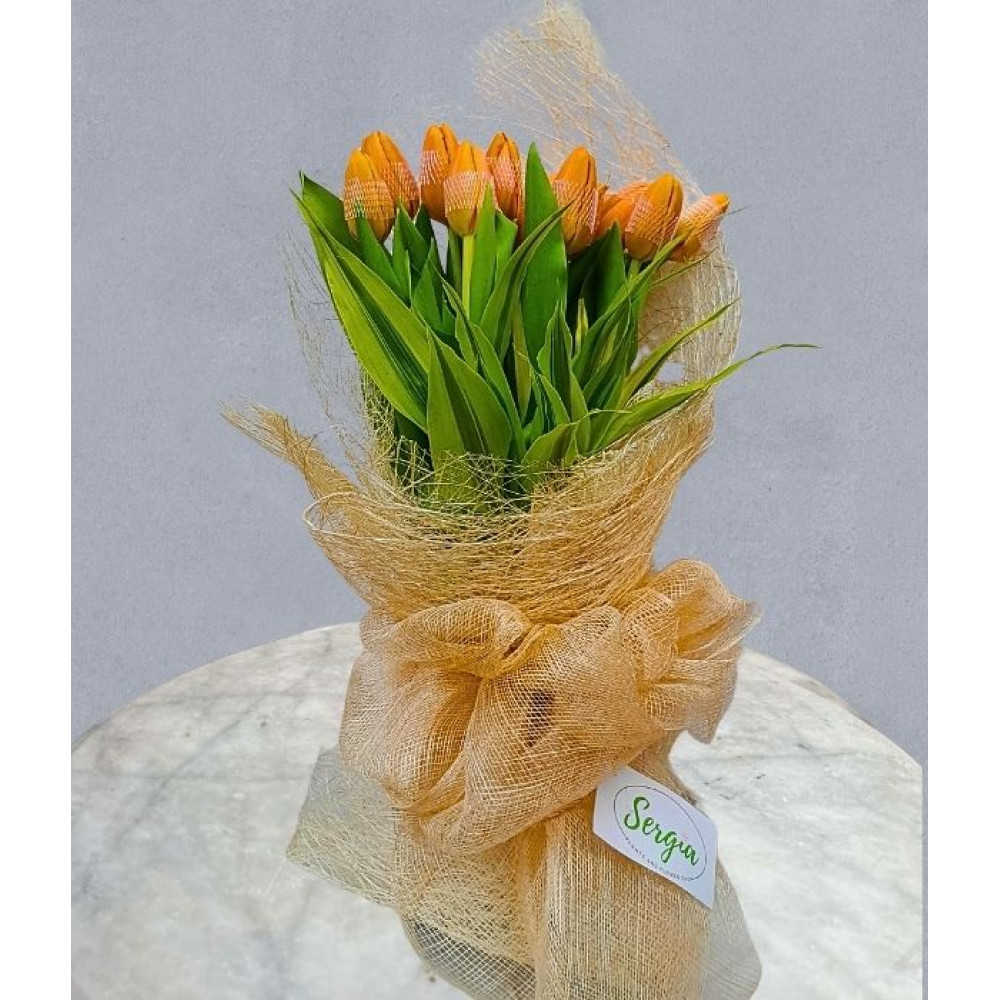 This bouquet features vibrant tulips, delicately wrapped in natural burlap, complemented by the fresh green leaves. Wrapped in a burlap and tied with a simple bow, this timeless floral arrangement adds a charming touch. Ideal for expressing love, appreciation, or admiration.