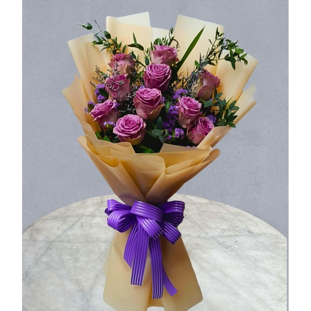 This elegant bouquet features purple china roses, complemented by purple filler flowers. Wrapped in a warm beige paper and tied with a purple ribbon. The perfect gift for any special occasion, especially as a romantic gesture to someone you care about.