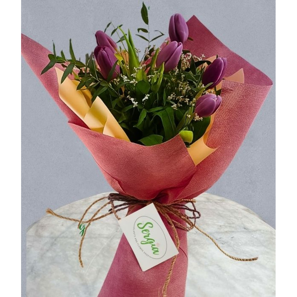 This lovely bouquet features elegant purple tulips, beautifully