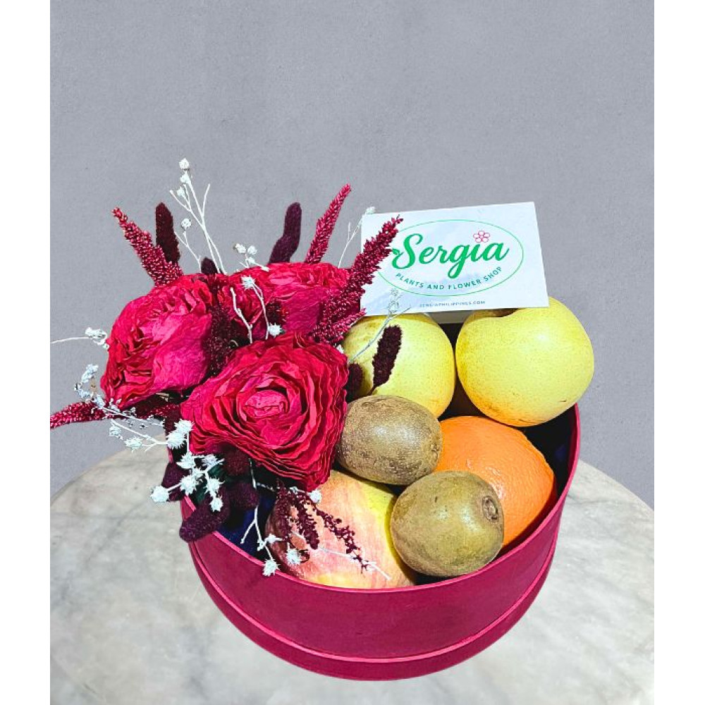 This elegant red box is surrounded by a variety of fresh fruits. Filled with different fruits and dried flowers in the middle of the fruit box. A perfect gesture for any special occasion, may it be a corporate event, a housewarming gift, or simply as a surprise, this would put a smile on someone’s face.
