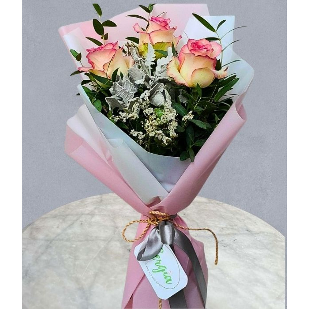 This elegant bouquet features soft pink roses, complemented by lush greenery and baby’s breath. Wrapped in soft pink and white paper and tied with a silver satin ribbon. A perfect gift for expressing love and admiration to someone special.
