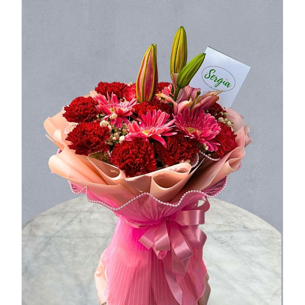 gerberas, and fresh lilies paired with filler flowers. Beautifully arranged