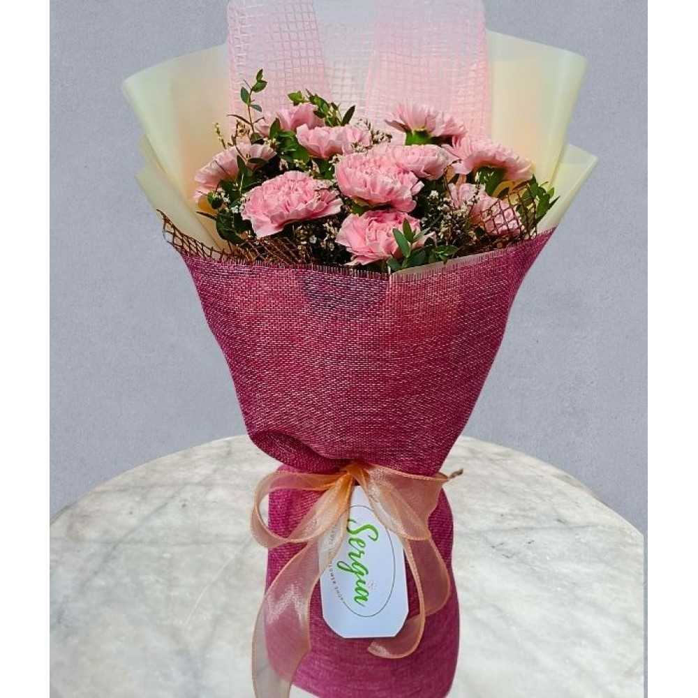 This charming bouquet features soft pink carnations, surrounded by delicate greenery and white fillers. Wrapped in stylish pink fabric and enclosed in a ribbon, this elegant arrangement is perfect for any occasion. It makes a thoughtful gift for expressing admiration and appreciation to someone special.