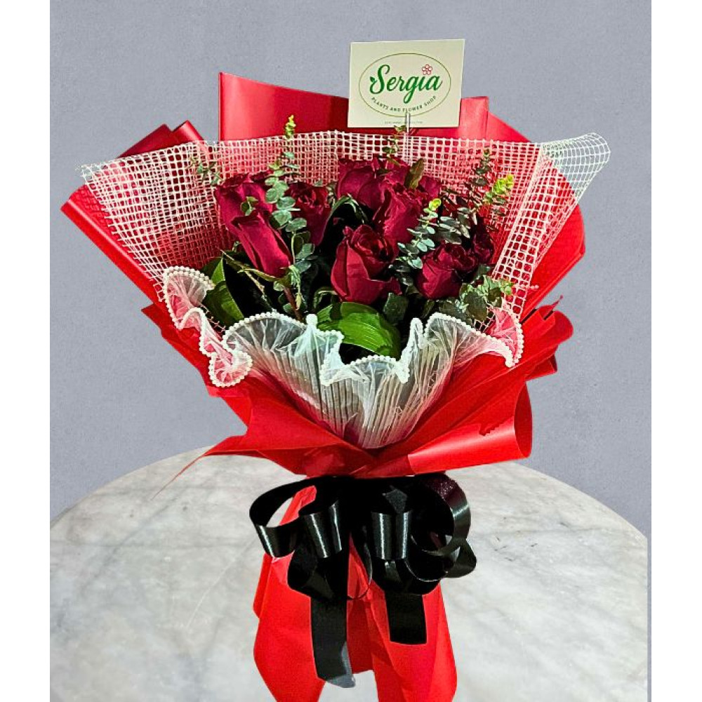 This lovely bouquet features fresh red roses, complemented by eucalyptus and filler flowers. Beautifully arranged in a red wrapper with a black ribbon. Perfect for a romantic gesture, it is a thoughtful way to express your admiration, appreciation, and love for someone special.