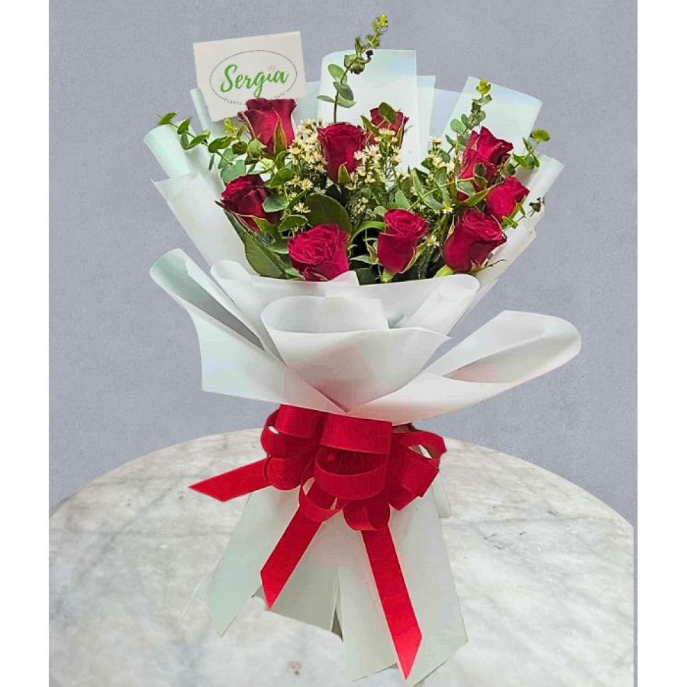 This bouquet features fresh red roses, complemented by lush greenery and filler flowers. Arranged in a white wrapper with a vibrant red ribbon. Ideal for any occasion, it is a thoughtful gesture that can leave a lasting impression on someone special.