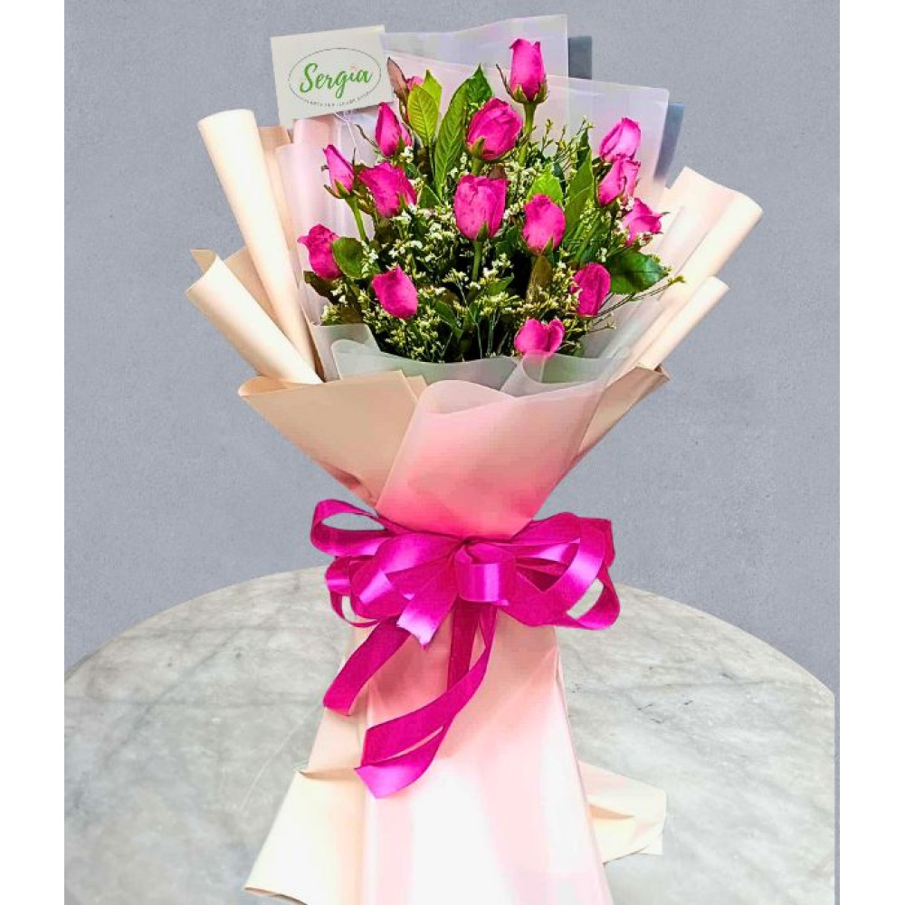 This bouquet features vibrant pink roses, filled with filler flowers. Elegantly arranged in a soft pastel wrapper and tied with pink ribbon. This arrangement is a perfect gift to celebrate any special occasion and an ideal way to show appreciation to someone special.