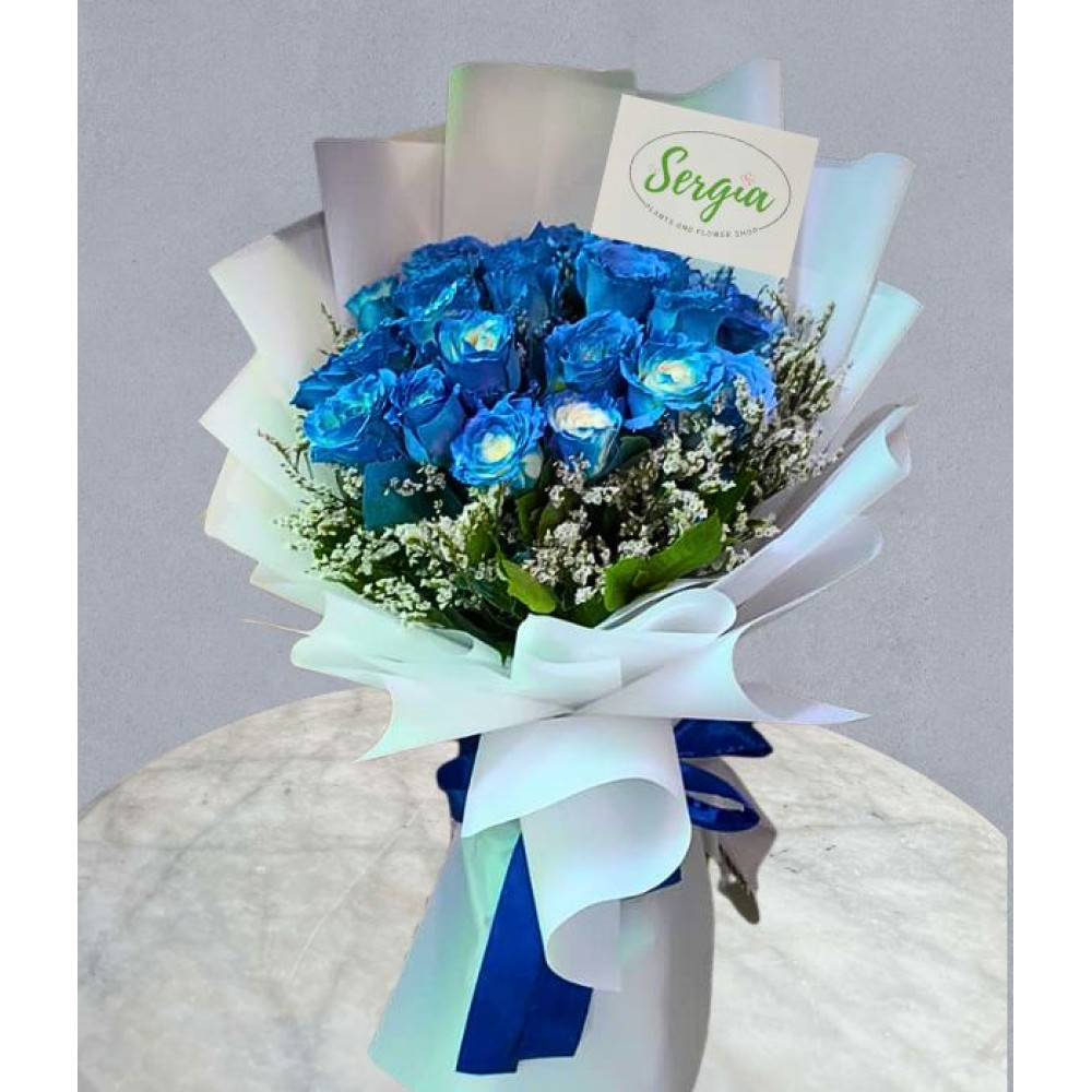 A charming arrangement of sprayed blue local roses, elegantly filled with delicate filler flowers. Wrapped in a blue wrapper and then tied with a blue ribbon. Perfect for any special occasion, this unique arrangement adds a bold touch of elegance and makes a memorable gift for any celebratory event.