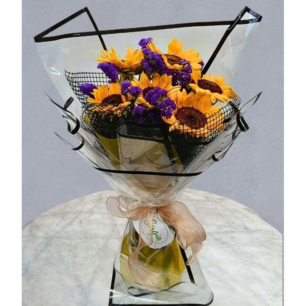 This bouquet features a stunning mix of sunflowers and purple filler