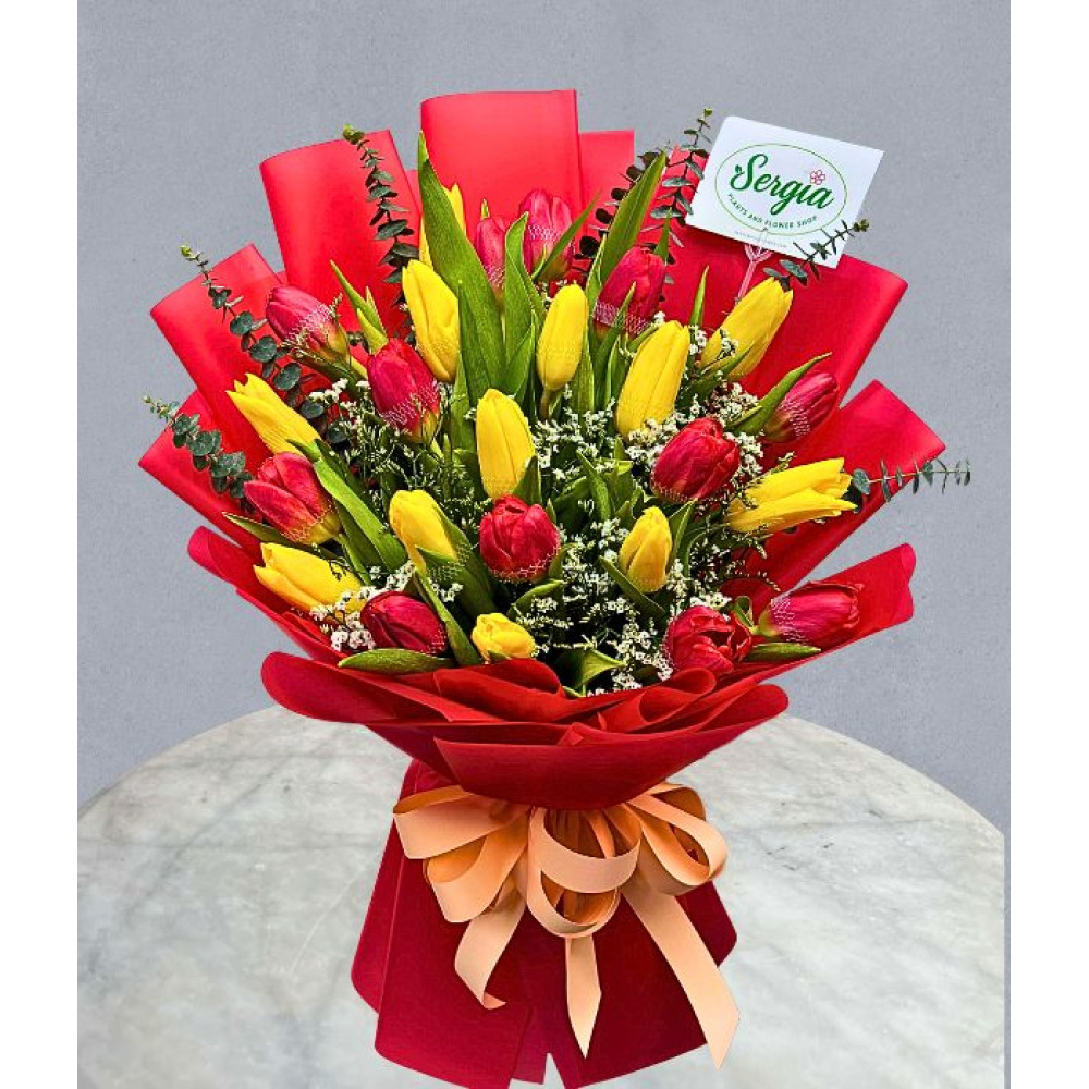 12 pieces of Red Tulips, 12 pieces of Yellow Tulips, and Filler Flowers